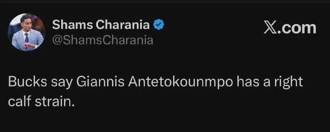 爆料王Shams:字母哥右小腿拉伤,预计缺席2-4周时间。