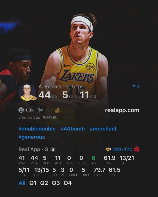 里夫斯单场至少40分5篮板10助攻5三分 成湖人队史第三人